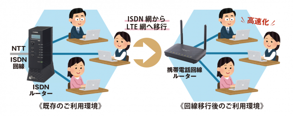 現在、ISDNルーターをお使いの環境の場合は、携帯電話(モバイル)回線ルーターに、置き換えることができます。